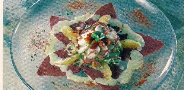 Finalize com 1 colher de sopa de molho.Espalhe sobre o centro da salada, a fatia restante da picanha defumada.