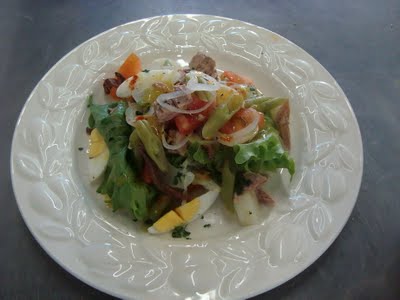 Coloque num prato graúdo de 30cm as quatro folhas de alface americana,agregue o atum desfiado por cima,incorpore a metade das rodelas de cebola,o tomate,vagem e a metade dos ovos cozidos.